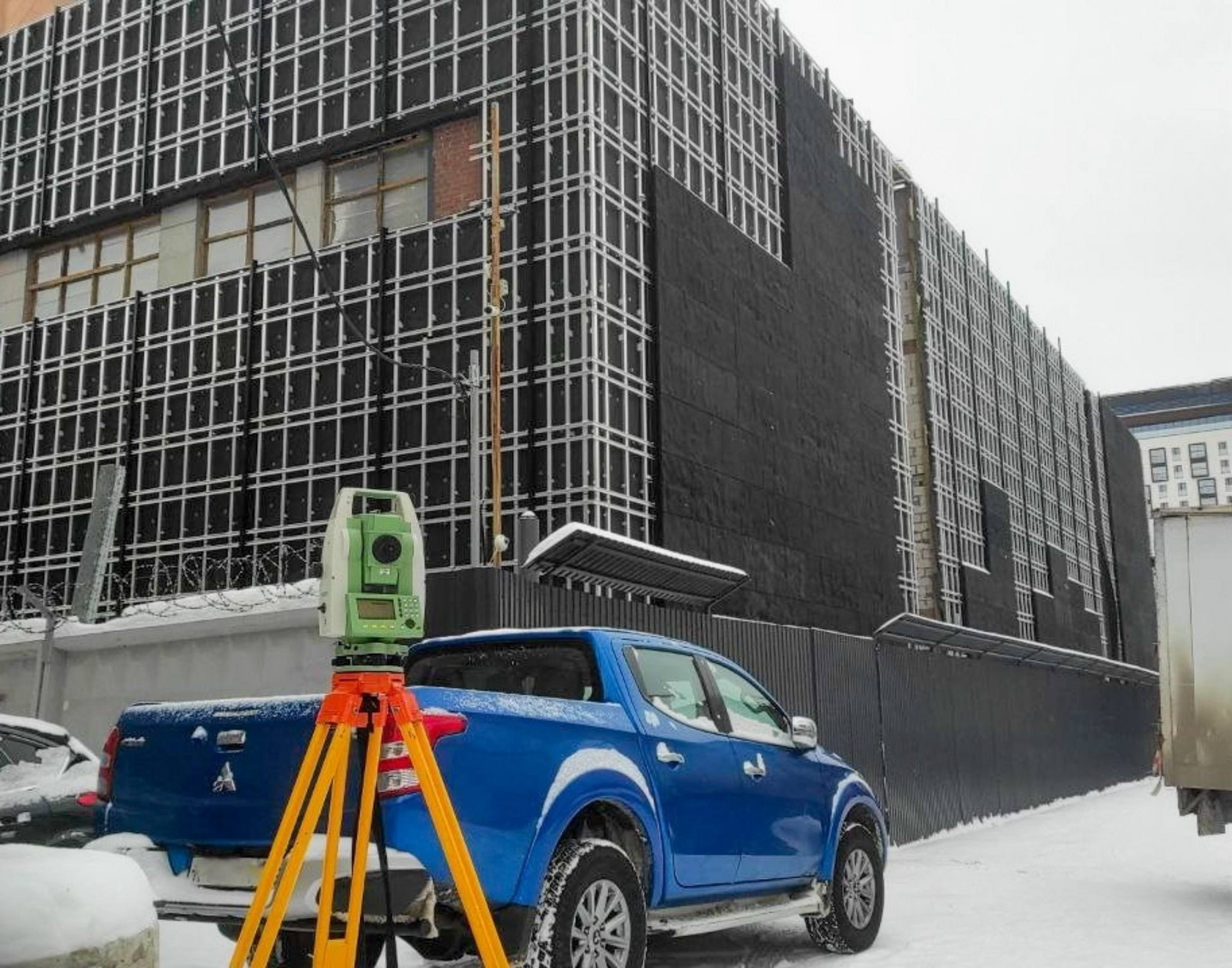 Сейчас на площадке ведётся вынос осевых и реперных точек, по которым осуществляется монтаж фасада. Параллельно специалисты контролируют положение уже установленных панелей. Фасад собирается с высокой точностью — отклонения не превышают 1–2 мм, геодезический контроль ведётся на постоянной основе.